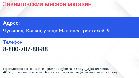 Звениговский, мясной магазин по адресу Чувашия, Канаш, улица Машиностроителей, 9 в дальнейшем Организация, размещена в следующих категориях: