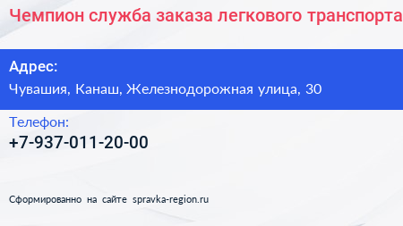 Чемпион, служба заказа легкового транспорта по адресу Чувашия, Канаш, Железнодорожная улица, 30 в дальнейшем Организация, размещена в следующих категориях: