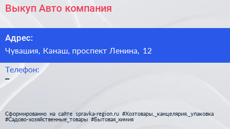 Выкуп-Авто, компания по адресу Чувашия, Канаш, проспект Ленина, 12 в дальнейшем Организация, размещена в следующих категориях: