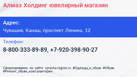 Алмаз-Холдинг, ювелирный магазин по адресу Чувашия, Канаш, проспект Ленина, 12 в дальнейшем Организация, размещена в следующих категориях: