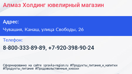 Алмаз-Холдинг, ювелирный магазин по адресу Чувашия, Канаш, улица Свободы, 26 в дальнейшем Организация, размещена в следующих категориях: