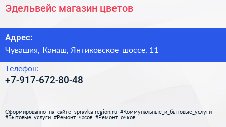 Эдельвейс, магазин цветов по адресу Чувашия, Канаш, Янтиковское шоссе, 11 в дальнейшем Организация, размещена в следующих категориях: