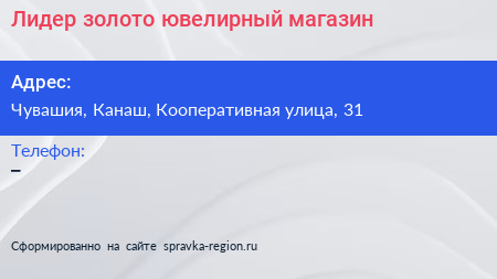 Лидер-золото, ювелирный магазин по адресу Чувашия, Канаш, Кооперативная улица, 31 в дальнейшем Организация, размещена в следующих категориях: