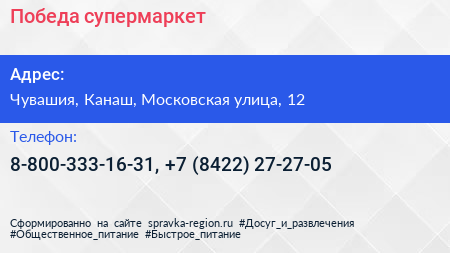 Победа, супермаркет по адресу Чувашия, Канаш, Московская улица, 12 в дальнейшем Организация, размещена в следующих категориях: