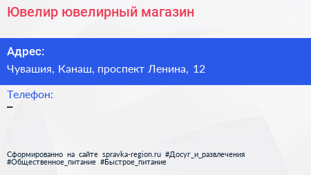 Ювелир, ювелирный магазин по адресу Чувашия, Канаш, проспект Ленина, 12 в дальнейшем Организация, размещена в следующих категориях: