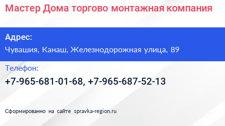 Мастер Дома, торгово-монтажная компания по адресу Чувашия, Канаш, Железнодорожная улица, 89 в дальнейшем Организация, размещена в следующих категориях: