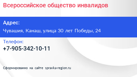 Всероссийское общество инвалидов по адресу Чувашия, Канаш, улица 30 лет Победы, 24 в дальнейшем Организация, размещена в следующих категориях: