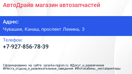 АвтоДрайв, магазин автозапчастей по адресу Чувашия, Канаш, проспект Ленина, 3 в дальнейшем Организация, размещена в следующих категориях: