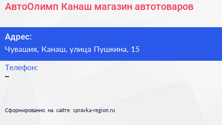АвтоОлимп Канаш, магазин автотоваров по адресу Чувашия, Канаш, улица Пушкина, 15 в дальнейшем Организация, размещена в следующих категориях: