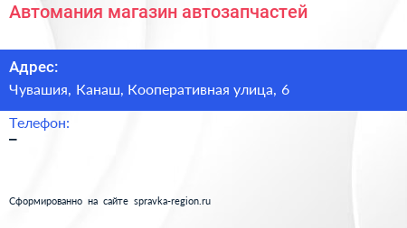 Автомания, магазин автозапчастей по адресу Чувашия, Канаш, Кооперативная улица, 6 в дальнейшем Организация, размещена в следующих категориях:
