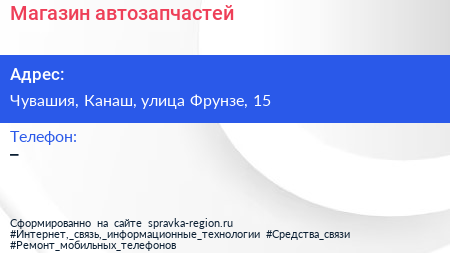 Магазин автозапчастей по адресу Чувашия, Канаш, улица Фрунзе, 15 в дальнейшем Организация, размещена в следующих категориях: