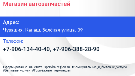 Магазин автозапчастей по адресу Чувашия, Канаш, Зелёная улица, 39 в дальнейшем Организация, размещена в следующих категориях: