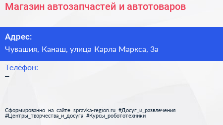 Магазин автозапчастей и автотоваров по адресу Чувашия, Канаш, улица Карла Маркса, 3а в дальнейшем Организация, размещена в следующих категориях: