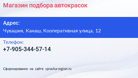Магазин подбора автокрасок по адресу Чувашия, Канаш, Кооперативная улица, 12 в дальнейшем Организация, размещена в следующих категориях: