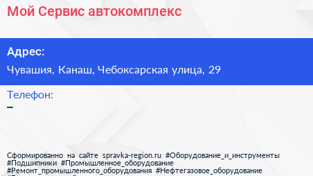 Мой Сервис, автокомплекс по адресу Чувашия, Канаш, Чебоксарская улица, 29 в дальнейшем Организация, размещена в следующих категориях: