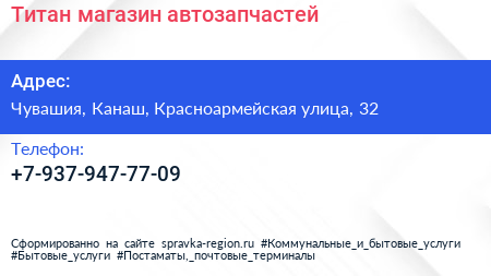 Титан, магазин автозапчастей по адресу Чувашия, Канаш, Красноармейская улица, 32 в дальнейшем Организация, размещена в следующих категориях: