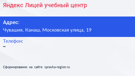Яндекс.Лицей, учебный центр по адресу Чувашия, Канаш, Московская улица, 19 в дальнейшем Организация, размещена в следующих категориях: