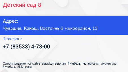 Детский сад №8 по адресу Чувашия, Канаш, Восточный микрорайон, 13 в дальнейшем Организация, размещена в следующих категориях: