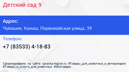 Детский сад №9 по адресу Чувашия, Канаш, Первомайская улица, 39 в дальнейшем Организация, размещена в следующих категориях: