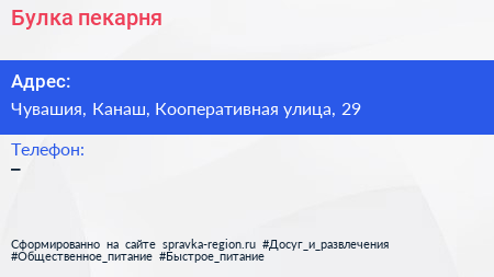 Булка, пекарня по адресу Чувашия, Канаш, Кооперативная улица, 29 в дальнейшем Организация, размещена в следующих категориях: