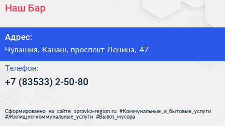 Наш Бар по адресу Чувашия, Канаш, проспект Ленина, 47 в дальнейшем Организация, размещена в следующих категориях: