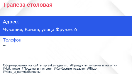 Трапеза, столовая по адресу Чувашия, Канаш, улица Фрунзе, 6 в дальнейшем Организация, размещена в следующих категориях: