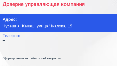 Доверие, управляющая компания по адресу Чувашия, Канаш, улица Чкалова, 15 в дальнейшем Организация, размещена в следующих категориях: