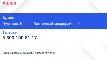Халва по адресу Чувашия, Канаш, Восточный микрорайон, 6 в дальнейшем Организация, размещена в следующих категориях: