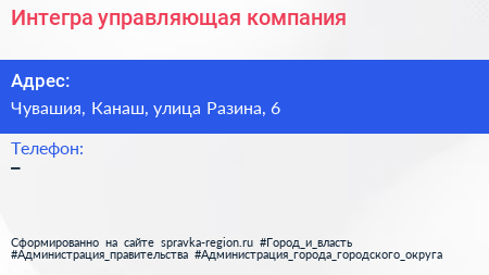 Интегра, управляющая компания по адресу Чувашия, Канаш, улица Разина, 6 в дальнейшем Организация, размещена в следующих категориях: