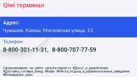 Qiwi, терминал по адресу Чувашия, Канаш, Московская улица, 13 в дальнейшем Организация, размещена в следующих категориях: