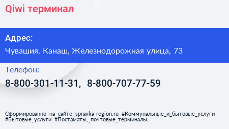 Qiwi, терминал по адресу Чувашия, Канаш, Железнодорожная улица, 73 в дальнейшем Организация, размещена в следующих категориях:
