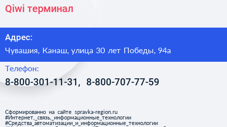 Qiwi, терминал по адресу Чувашия, Канаш, улица 30 лет Победы, 94а в дальнейшем Организация, размещена в следующих категориях: