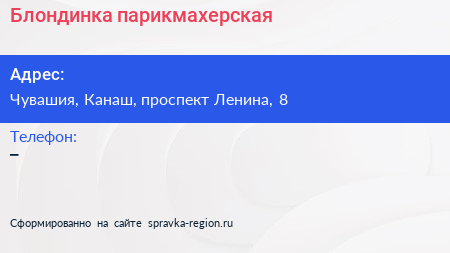 Блондинка, парикмахерская по адресу Чувашия, Канаш, проспект Ленина, 8 в дальнейшем Организация, размещена в следующих категориях: