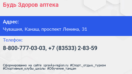 Будь Здоров!, аптека по адресу Чувашия, Канаш, проспект Ленина, 31 в дальнейшем Организация, размещена в следующих категориях: