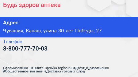 Будь здоров, аптека по адресу Чувашия, Канаш, улица 30 лет Победы, 27 в дальнейшем Организация, размещена в следующих категориях: