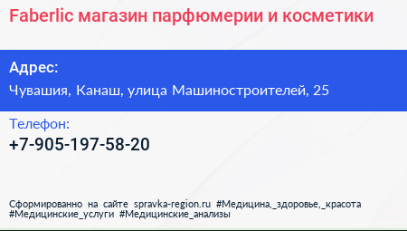 Faberlic, магазин парфюмерии и косметики по адресу Чувашия, Канаш, улица Машиностроителей, 25 в дальнейшем Организация, размещена в следующих категориях: