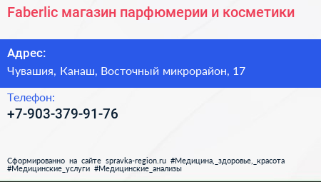 Faberlic, магазин парфюмерии и косметики по адресу Чувашия, Канаш, Восточный микрорайон, 17 в дальнейшем Организация, размещена в следующих категориях: