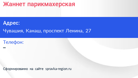 Жаннет, парикмахерская по адресу Чувашия, Канаш, проспект Ленина, 27 в дальнейшем Организация, размещена в следующих категориях: