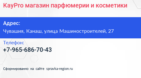 KayPro, магазин парфюмерии и косметики по адресу Чувашия, Канаш, улица Машиностроителей, 27 в дальнейшем Организация, размещена в следующих категориях: