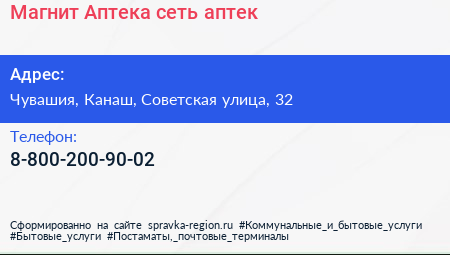 Магнит Аптека, сеть аптек по адресу Чувашия, Канаш, Советская улица, 32 в дальнейшем Организация, размещена в следующих категориях: