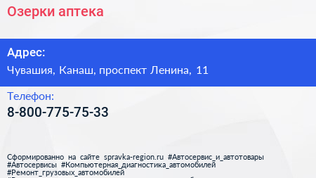 Озерки, аптека по адресу Чувашия, Канаш, проспект Ленина, 11 в дальнейшем Организация, размещена в следующих категориях: