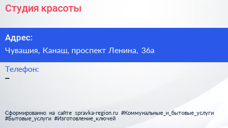 Студия красоты по адресу Чувашия, Канаш, проспект Ленина, 36а в дальнейшем Организация, размещена в следующих категориях: