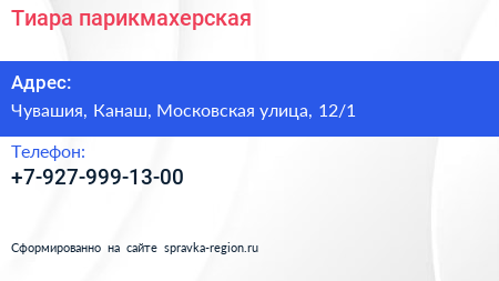 Тиара, парикмахерская по адресу Чувашия, Канаш, Московская улица, 12/1 в дальнейшем Организация, размещена в следующих категориях:
