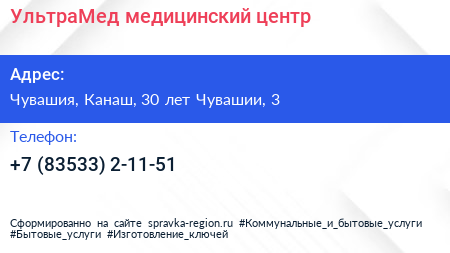 УльтраМед, медицинский центр по адресу Чувашия, Канаш, 30 лет Чувашии, 3 в дальнейшем Организация, размещена в следующих категориях: