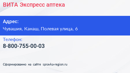 ВИТА Экспресс, аптека по адресу Чувашия, Канаш, Полевая улица, 6 в дальнейшем Организация, размещена в следующих категориях: