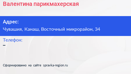 Валентина, парикмахерская по адресу Чувашия, Канаш, Восточный микрорайон, 34 в дальнейшем Организация, размещена в следующих категориях: