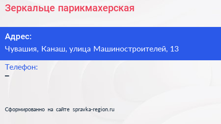 Зеркальце, парикмахерская по адресу Чувашия, Канаш, улица Машиностроителей, 13 в дальнейшем Организация, размещена в следующих категориях: