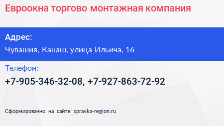 Евроокна, торгово-монтажная компания по адресу Чувашия, Канаш, улица Ильича, 16 в дальнейшем Организация, размещена в следующих категориях: