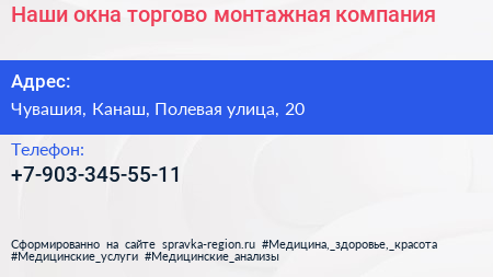 Наши окна, торгово-монтажная компания по адресу Чувашия, Канаш, Полевая улица, 20 в дальнейшем Организация, размещена в следующих категориях: