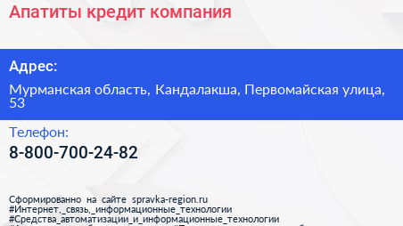 Апатиты-кредит, компания по адресу Мурманская область, Кандалакша, Первомайская улица, 53 в дальнейшем Организация, размещена в следующих категориях: